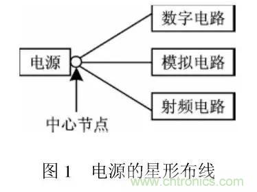 星形布線是模擬電路設(shè)計(jì)中眾所周知的技巧(如圖1所示) 。星形布線———電路板上各模塊具有各自的來自公共供電電源點(diǎn)的電源線路。在這種情況下,星形布線意味著電路的數(shù)字部分和RF 部分應(yīng)有各自的電源線路,這些電源線應(yīng)在靠近IC 處分別去耦。這是一個(gè)隔開來自數(shù)字