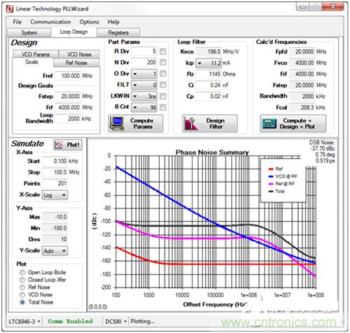 在 PLLWizard GUI 中輸入所希望的fPFD和 LBW 值并點(diǎn)擊幾下鼠標(biāo)后,我們就有了環(huán)路濾波器組件值,我們可以將這些組件安裝到 LTC6946 電路中。圖 1 的屏幕截圖顯示,PLLWizard 工具是怎樣簡化 LTC6946 的設(shè)計過程的。為了核實(shí)我們的工作是否正確,我們在給定條件下仿真LTC6946 的預(yù)期相位噪聲。圖 1 包括 PLLWizard 的預(yù)測。