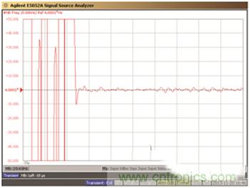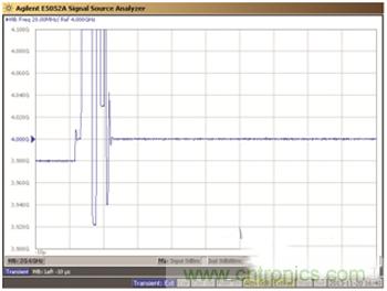 現(xiàn)在,我們來檢查一下,從 3.98GHz到 4.00GHz階躍 20MHz 之后,LTC6946 的輸出穩(wěn)定到與最終頻率值相差 10kHz 以內(nèi)有多快。E5052A 可捕捉瞬態(tài)響應(yīng),如圖 3 所示。