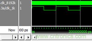 根據(jù)所需的時(shí)鐘頻率為1kHz的時(shí)鐘,而晶振時(shí)鐘的頻率為8192kHz,晶振時(shí)鐘與所需的時(shí)鐘頻率恰巧是8192倍的整數(shù)倍關(guān)系,因此需要對(duì)8192kHz的晶振時(shí)鐘進(jìn)行8192分頻來(lái)獲得所需要的時(shí)鐘。根據(jù)整數(shù)倍分頻器的設(shè)計(jì)方法原理,通過(guò)ISE9.1邏輯設(shè)計(jì)工具,利用VHDL硬件描述語(yǔ)言來(lái)進(jìn)行8192分頻的分頻器設(shè)計(jì)。然而8192又是偶數(shù),所以需要設(shè)計(jì)的是偶數(shù)分頻器。對(duì)設(shè)計(jì)的內(nèi)容通過(guò)Modelsim6.5仿真軟件進(jìn)行仿真驗(yàn)證,結(jié)果如圖3-4所示。