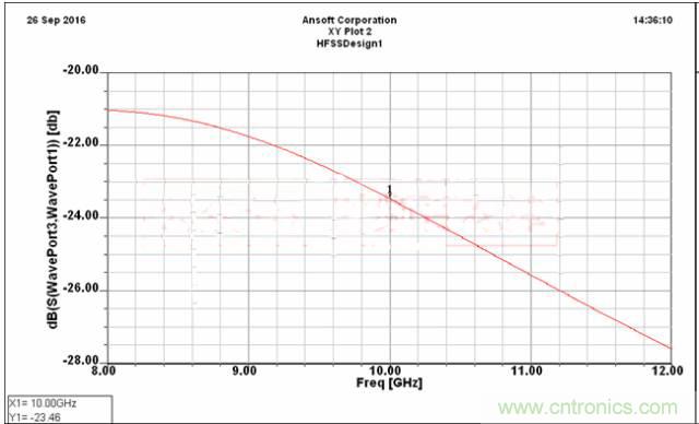 添加的C形環(huán)受到相同的磁場耦合,產(chǎn)生與主線相反的電流,從而對(duì)主線進(jìn)行二次耦合,增強(qiáng)了主線的耦合度。仿真了1mm耦合間距的耦合度,仿真結(jié)果如下圖4所示。在10GHz耦合-18.72dB,x波段耦合度-17.25~-19.27dB,波動(dòng)2dB左右。