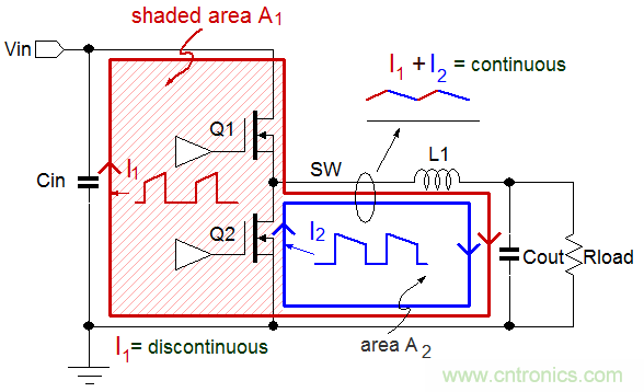 在上面所述的回路中,電流環(huán)I1和I2共同共享了自開(kāi)關(guān)節(jié)點(diǎn)→電感→輸出電容→地→Q2的源極這一段路徑。I1和I2合成起來(lái)后就形成了一個(gè)相對(duì)平緩、連續(xù)的鋸齒狀波形,由于其中不存在電流變化率dI/dt極高的邊沿,其包含的高頻成分就要少一些。