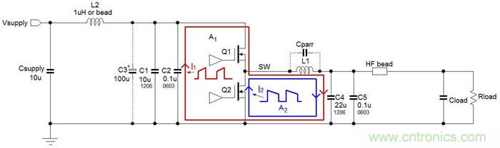 從電磁輻射的角度來(lái)看,圖3中存在陰影的A1區(qū)域是存在高電流變化率dI/dt的回路部分,這個(gè)回路將生成最多的高頻成分,因而在Buck轉(zhuǎn)換器的EMI設(shè)計(jì)中是需要被重點(diǎn)考慮的最關(guān)鍵部分。圖中A2區(qū)域的電流變化率dI/dt就沒(méi)有A1區(qū)域的高,因而生成的高頻噪聲也就比較少。