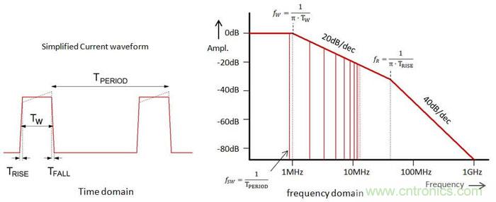為了理解這能導(dǎo)致多大程度的改進(jìn),我們需要對(duì)不連續(xù)電流脈沖的高頻成分進(jìn)行一番探討。圖6左側(cè)顯示的是簡(jiǎn)化為梯形了的電流波形,其周期為TPERIOD,脈沖寬度為TW,脈沖上升/下降時(shí)間為TRISE。從頻域來(lái)看此信號(hào),其中含有基頻成分和很多高次諧波成分,通過(guò)傅里葉分析可以知道這些高頻成分的幅度和脈沖寬度、上升/下降時(shí)間之間的關(guān)系,這種關(guān)系被表現(xiàn)在圖6的右側(cè)。