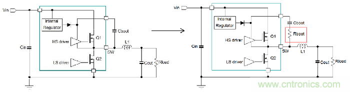 在MOSFET外置的設(shè)計(jì)中,電阻可被串接到上橋MOSFET的柵極上,這就可以同時(shí)增加上橋的導(dǎo)通時(shí)間和截止時(shí)間。