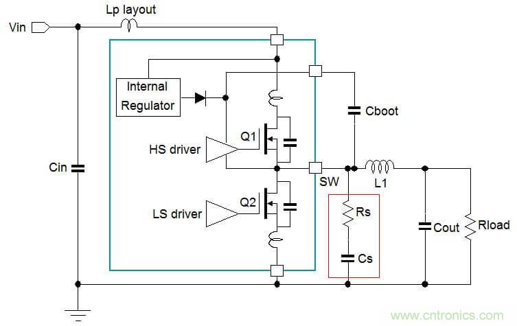 RL緩沖抑制電路最好是被放置在緊靠功率級(jí)的輸入節(jié)點(diǎn)上。RL抑制電路帶來(lái)的一個(gè)不足是它會(huì)在高頻區(qū)域?yàn)殚_(kāi)關(guān)回路引入一個(gè)阻抗,當(dāng)開(kāi)關(guān)狀態(tài)發(fā)生快速變換的時(shí)候,切換中的電流脈沖會(huì)在電阻Rs上形成一個(gè)短時(shí)的電壓毛刺,從而在功率級(jí)的輸入節(jié)點(diǎn)上也出現(xiàn)一個(gè)小小的毛刺。假如輸入端的電壓毛刺使電壓變得太高或太低,功率級(jí)的開(kāi)關(guān)切換或IC的工作就會(huì)受到影響。因此,當(dāng)加入了RL緩沖抑制電路的時(shí)候,一定要在最大負(fù)載狀態(tài)下對(duì)輸入節(jié)點(diǎn)上的電壓毛刺情況進(jìn)行檢查,避免由此可能帶來(lái)的問(wèn)題發(fā)生。