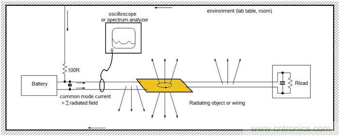 當(dāng)被測(cè)試對(duì)象被放在實(shí)驗(yàn)桌上時(shí),其PCB上的電流回路和導(dǎo)線就會(huì)向周圍環(huán)境輻射出高頻能量,這些輻射信號(hào)又會(huì)自己找到路徑返回到測(cè)試對(duì)象上,并以高頻共模電流的形式出現(xiàn)在供電線上。這些供電線上的高頻共模電流會(huì)和板上的電流結(jié)合在一起,可被用著輻射狀況的指示信號(hào)。