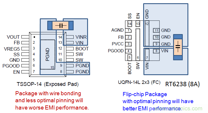 在RT7297CHZSP中,芯片底部的散熱焊盤(pán)是沒(méi)有和晶圓內(nèi)核連接在一起的,所以在PCB布局中將銅箔和散熱焊盤(pán)連接在一起并不能縮短CIN回路。它的上橋MOSFET和下橋MOSFET通過(guò)多根邦定線連接到VIN和GND端子,因而可以通過(guò)這兩個(gè)端子形成最短的回路。