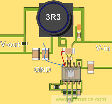 將輸出電容地放在不與輸入電容切換路徑發(fā)生重疊的地方,避免高頻噪聲串入輸出電壓中。