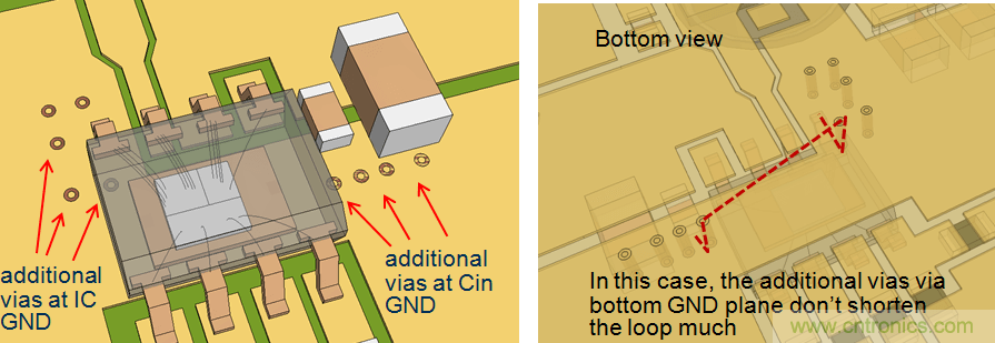 在上面的例子中,通到地線層的附加導(dǎo)通孔對(duì)縮減CIN回路的長(zhǎng)度沒(méi)有幫助。但在另一個(gè)例子中,由于頂層的路徑很長(zhǎng),通過(guò)導(dǎo)通孔來(lái)縮小回路面積就十分有效。