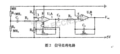 信號采集電路中的InSb-In薄膜磁阻元件采用三端差分型接法如圖1(b)所示,這種信號采集電路具有輸出信號較大和較強(qiáng)抑制溫漂的能力。信號處理電路采用阻容耦合型差動(dòng)放大電路,在圖2中IC1和IC2為兩級差動(dòng)放大,改變R2,R7,R5,R8的阻值可以調(diào)整放大倍數(shù)。集成運(yùn)放的靜態(tài)電壓由R3和R6來調(diào)節(jié),考慮到通常磁頭內(nèi)的上、下兩個(gè)磁阻元件不完全平衡,MR1與MR2的阻值會(huì)有10%以內(nèi)的差別,在+5 V的工作電源下,信號采集的輸出端電壓在2.4~2.6 V。為了減少信號在磁頭與運(yùn)放之間阻容耦合中的損失,一般把集成運(yùn)放靜態(tài)電壓設(shè)置為低于2.5 V,取2 V比較合適。