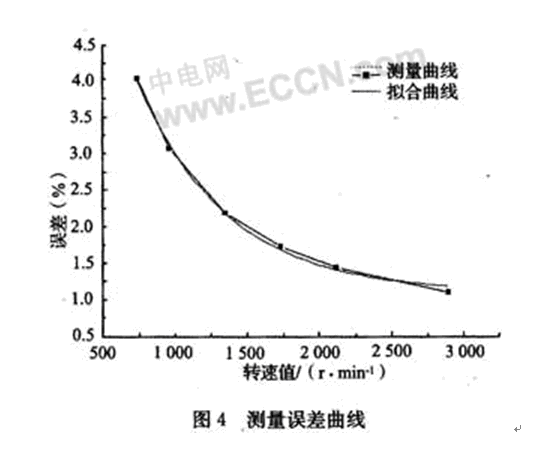 首先在軟件中給出轉(zhuǎn)速預(yù)設(shè)值,即給定常量speed的值,觀察速度穩(wěn)定后七段數(shù)碼管的數(shù)值,比較實(shí)際測量的轉(zhuǎn)速值和預(yù)設(shè)轉(zhuǎn)速值,計算測量誤差,評價測量的準(zhǔn)確性,測試結(jié)果如表1所示。根據(jù)實(shí)驗(yàn)測試和誤差分析繪制了測量誤差曲線,如圖4所示。誤差分析表明,轉(zhuǎn)速測量誤差在5%以內(nèi),并且隨著轉(zhuǎn)速預(yù)設(shè)值的增加測量誤差愈小,呈指數(shù)形式下降,函數(shù)關(guān)系如式(3)所示。