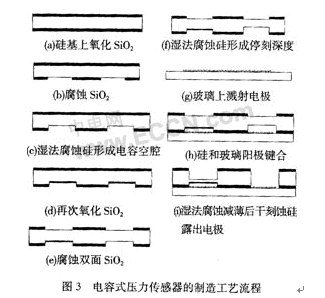 整個(gè)制造流程都采用標(biāo)準(zhǔn)工藝,如圖3所示。先熱氧化100 nm的SiO2,既作為腐蝕Si的掩膜,又作為電容兩電極的絕緣層。利用各向異性腐蝕形成電容空腔和將來(lái)露電極的??滩?,如果硅片厚度一致且KOH腐蝕速率均勻,此法可以在相當(dāng)程度上等效于自停止腐蝕。從玻璃上引出電容兩電極,然后和硅片進(jìn)行陽(yáng)極鍵合。鍵合片利用KOH腐蝕減薄后反應(yīng)離子深刻蝕露出測(cè)量電極。