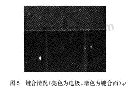 目前真空腔的形成多采用Si—Si鍵合或者陽(yáng)極鍵合。本方案采用陽(yáng)極鍵合,是因?yàn)殛?yáng)極鍵合比Si—Si鍵合的要求低。首先溫度只需要400~500℃,其次表面光潔度要求也相對(duì)較低。本工藝過(guò)程中存在金屬電極,不適于用高溫;鍵合面存在高約1400 nm,寬為20μm的電極引線,鍵合面的SiO2經(jīng)過(guò)一定程度的KOH各向異性腐蝕后粗糙度為100nm左右,經(jīng)過(guò)試驗(yàn)證明,鍵合情況良好(圖5),并具有良好的密封效果。