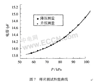 在室溫19.34℃的條件下,對(duì)壓力傳感器進(jìn)行測(cè)量。測(cè)量設(shè)備為Druck的DPI610IS,測(cè)量電路采用了AD公司的AD7745電容測(cè)量芯片,精度能達(dá)到4 fF。測(cè)量曲線如圖7所示,測(cè)試精度為8.1‰。由于硅薄膜較厚,測(cè)量范圍內(nèi)的線性部分不多,此外電容電極的面積利用率不高使得電容的變化量也小,這些都是造成性能不高的主要原因,但由圖可以看出測(cè)量曲線存在很好的一致性和重復(fù)性。