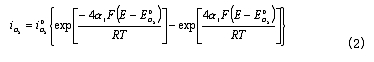 為CO的交換電流密度;a為CO氧化反應(yīng)的電荷傳遞系數(shù)。——— 在平衡條件下,上述兩反應(yīng)的電流密度相等,所以有