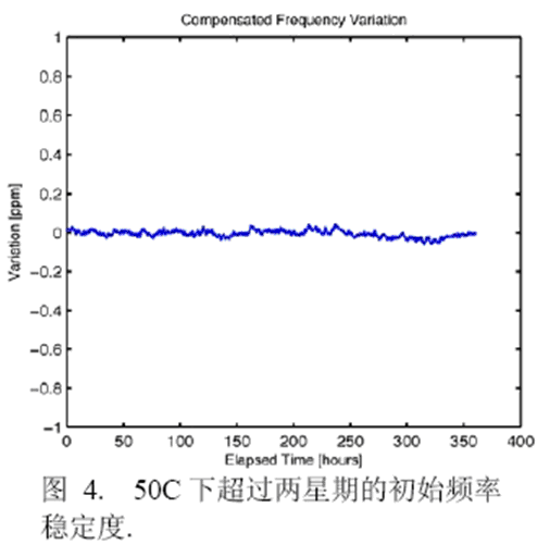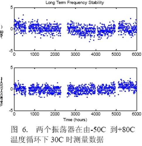 圖6顯示了在進行溫度循環(huán)試驗時兩個振蕩器的頻率穩(wěn)定度。數(shù)據(jù)在-50℃到+80℃正溫度循環(huán)和負(fù)溫度循環(huán)中的30℃情況下獲得,數(shù)據(jù)采集自600個溫度循環(huán),以3ppm為規(guī)范容許范圍則沒有頻率漂移。