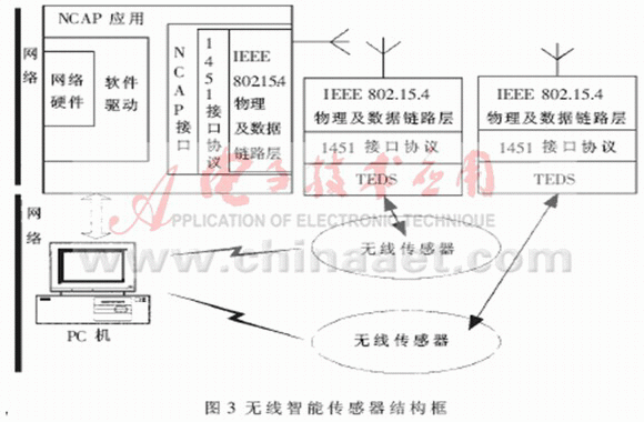 應(yīng)用層(完成NCAP功能PC主機軟件)和無線傳感器終端模塊(智能傳感器接口模塊STIM)都通過IEEE1451接口協(xié)議與最低層的IEEE802.15.4模塊進行通信。