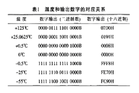 DS18B20溫度傳感器主要用于對(duì)溫度進(jìn)行測(cè)量,數(shù)據(jù)可用16位符號(hào)擴(kuò)展的二進(jìn)制補(bǔ)碼讀數(shù)形式提供,并以0.0625℃/LSB形式表示。具體的溫度和數(shù)字量的關(guān)系如表1所列。