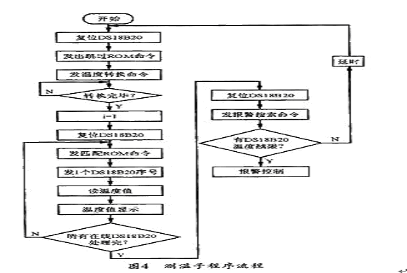 本系統(tǒng)程序主要包括主程序、讀出溫度子程序、溫度轉(zhuǎn)換命令子程序、計(jì)算溫度子程序、顯示數(shù)據(jù)刷新子程序等。編程時(shí)必須嚴(yán)格按照DS18B20的時(shí)序規(guī)定進(jìn)行。尤其需要注意的是,在多點(diǎn)溫度測(cè)量中,由于多個(gè)DS18B20掛在一條總線上,為識(shí)別不同的器件,在系統(tǒng)安裝之前,應(yīng)將主機(jī)逐個(gè)與DS18B20掛接,以讀出其序列號(hào)。具體是由主機(jī)先給DS18B20發(fā)一個(gè)復(fù)位脈沖,在DS18B20發(fā)回響應(yīng)脈沖給主機(jī)后,主機(jī)再發(fā)讀ROM命令(代碼33H),并發(fā)一個(gè)15μs左右的脈沖,接著再讀取DS18B20序列號(hào)的一位,并用同樣方法讀取序列號(hào)的每一位。其V-T曲線控制系統(tǒng)主程序和測(cè)溫子程序分別如圖3和圖4所示。