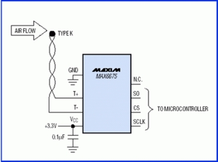 熱電偶由兩根不同的金屬線連在一起形成,金屬線之間的連接點產(chǎn)生一個與溫度近似成比例的電壓。其特點包括:寬溫度范圍(高達(dá)1250°C)、低成本、極低輸出電壓(對于K型,可低至40µV/°C量級)、適當(dāng)?shù)木€性及中等復(fù)雜的信號調(diào)理(冷端補(bǔ)償及放大)。有幾種不同的熱電偶類型,分別用字母來表示。最常見的是K型。由Maxim制造的IC (MAX6674及MAX6675)具有調(diào)整K型熱電偶信號的功能,從而可簡化設(shè)計,并極大地減少信號放大、冷端補(bǔ)償、輸出量化所需的器件數(shù)量。熱電偶可采用帶有裸露引線的探針形式。