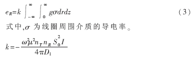 在發(fā)射頻率不高、介質導電率較小的條件下,可忽略電磁波傳播效應和渦流損耗,用幾何因子理論對接收線圈中的二次感應電動勢進行計算,將同軸于z的兩線圈周圍介質中的感應渦流分割成以探頭軸心為圓心、半徑為r、距線圈T和R距離分別為ρT和ρR的小單元環(huán)電流。將探頭周圍介質看作是均勻無限介質,把所有的單元環(huán)感生的電動勢疊加在一起得到: