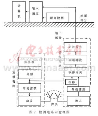 整個系統(tǒng)分為地上和地下兩部分,其基本組成結構如圖2所示。兩大部分之間通過電纜相連接。地下部分中包括裝有線圈的探頭以及分別屏蔽在兩個金屬盒中的發(fā)射電路和接收電路。地下部分的所有裝置全部固定安裝在一節(jié)經過防水處理的直徑為8cm左右的聚氯乙稀管內。為了防止對探頭檢測過程的干擾,設計時應該充分考慮地下部分的電路及導線的固定和屏蔽問題。