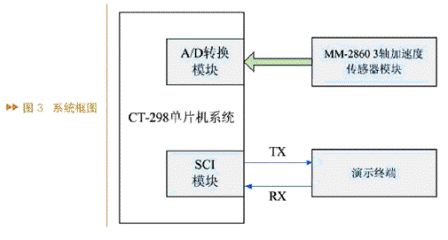 系統(tǒng)由三個(gè)部分組成:CT-298單片機(jī)控制部分、 MM-2860加速度傳感器部分、演示終端,系統(tǒng)框圖如圖3所示。