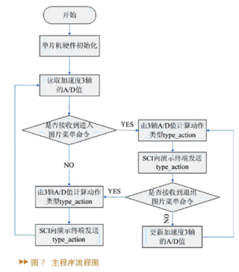 系統(tǒng)上電后,首先要對(duì)單片機(jī)的硬件系統(tǒng)進(jìn)行初始化、配置寄存器等操作,之后才可以進(jìn)行數(shù)據(jù)采集,將加速度的值進(jìn)行A/D轉(zhuǎn)換,得到量化的值。圖片菜單是二級(jí)菜單,如果沒(méi)有接到演示系統(tǒng)傳給單片機(jī)進(jìn)入二級(jí)菜單的指令,則單片機(jī)一直在主程序運(yùn)行,不斷地采集A/D值、進(jìn)行動(dòng)作判定,并向演示系統(tǒng)發(fā)送type_action的指令。演示系統(tǒng)可根據(jù)接收到的type_action的類(lèi)型采取相應(yīng)的動(dòng)作。如果單片機(jī)接收到進(jìn)入二級(jí)菜單的命令,則進(jìn)入圖片菜單,同時(shí)也執(zhí)行類(lèi)似于主程序的動(dòng)作判定程序,并不斷更新A/D采樣值,發(fā)送type_action,直到接收到退出二級(jí)菜單指令才退出。下面詳細(xì)介紹一下各個(gè)功能模塊的具體設(shè)置。