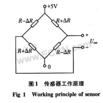 整個(gè)傳感器最關(guān)鍵的部分是其中的惠斯通電橋。當(dāng)外加磁場(chǎng)后,電橋的電阻變化,如圖1所示,引起傳感器輸出電壓Uout變化Uout=(△R/R)Ub,式中 Ub為傳感器工作電壓。