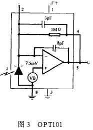 在本文中, 采用一種新型的光敏元件OPT101 , 該元件將感光部件和放大器集成在同一個芯片內(nèi)部, 這種集成化的設(shè)計(jì)方式有效地克服了后端運(yùn)算放大器空載電流輸出對光敏部件輸出電流的影響, 而且芯片輸出的電壓信號可以通過外部的精密電阻進(jìn)行調(diào)節(jié), 有利于芯片適應(yīng)整體的電路設(shè)計(jì), 同時(shí)芯片的集成化設(shè)計(jì)也能夠減小系統(tǒng)的功耗。