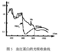 脈搏信號主要由動脈血的充盈引起, 而血液中還原血紅蛋白( Hb) 和氧合血紅蛋白( HbO2 ) 含量變化將造成透光率的變化, 當(dāng)氧合血紅蛋白和還原血紅蛋白對光的吸收量相等時(shí), 透射光的強(qiáng)度將主要由動脈血管的收縮和舒張引起, 此時(shí)能夠比較準(zhǔn)確地反映出脈搏信號。圖5 為血紅蛋白的光吸收曲線, 從圖中可以看出, 血液中HbO2 和Hb 對于不同波長光的吸收系數(shù)的差異明顯, 而且2 條曲線好幾個不同的交點(diǎn), 考慮到在805 nm 波長處, 血紅蛋白的光吸收率比較低, 那么透射過手指的光強(qiáng)較大, 有利于光敏器件的接收, 因此發(fā)射光源的波長選擇為805 nm。