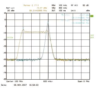 另一種可行解決方案是使用展頻振蕩器(Spread Spectrum Oscillator),來降低系統(tǒng)輻射出來的EMI電磁輻射干擾。圖4則顯示一個單頻信號的頻譜圖以及對該信號展頻后的頻譜圖。從圖中可知展頻后的頻率信號如何降低原來在接近100MHz的峰值。