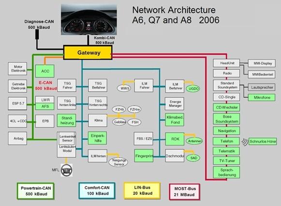 例如,可能會(huì)通過(guò)診斷用CAN總線來(lái)訪問(wèn)每個(gè)單獨(dú)的ECU、詢問(wèn)其狀態(tài)、讀取錯(cuò)誤代碼,甚至刷新程序固件。如今,出于成本考慮,許多應(yīng)用中常常會(huì)共享傳感器。這意味著一個(gè)傳感器模塊的測(cè)量值將被幾個(gè)ECU處理。