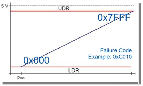 汽車傳感器目前所用的通信協(xié)議仍然是模擬輸出。這是典型的點(diǎn)對(duì)點(diǎn)連接——即一個(gè)傳感器與一個(gè)ECU連接,并以電壓作為其輸出信號(hào)。盡管已經(jīng)進(jìn)行了一些改善,例如提高分辨率,或增加診斷范圍(LDR,UDR,見(jiàn)圖4),但模擬輸出仍然是90年代至今該技術(shù)的核心。
