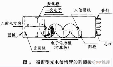 光電倍增管是一種真空器件。它由光電發(fā)射陰極(光陰極)和聚焦電極、電子倍增極及電子收集極(陽極)等組成。典型的光電倍增管按入射光接收方式可分為端窗式和側(cè)窗式兩種類型。圖1所示為端窗型光電倍增管的剖面結(jié)構(gòu)圖。其主要工作過程如下: