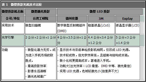 由于便攜式裝置內(nèi)建微型投影機(jī)風(fēng)潮興起,市場(chǎng)對(duì)于微型投影機(jī)的尺寸要求更加嚴(yán)苛。有業(yè)內(nèi)人士表示,相比發(fā)光二極管(LED)光源微型投影技術(shù)(表1),激光微型投影具有無限焦距、光機(jī)體積小、色彩飽和度高、低耗能等特性,后勢(shì)深具潛力。