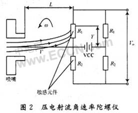 射流氣體陀螺是利用強(qiáng)迫對(duì)流氣體的氣流束(層流)和敏感元件的熱阻效應(yīng)來測(cè)量角速率的。目前,采用MEMS技術(shù)制作的射流微陀螺并不多。報(bào)道的射流氣體微陀螺主要由壓電驅(qū)動(dòng)泵、循環(huán)氣流通道及腔室、微噴嘴和熱敏元件等組成。它結(jié)構(gòu)簡(jiǎn)單,無活動(dòng)檢測(cè)質(zhì)量,抗過載能力強(qiáng),成本低,壽命長(zhǎng)。它是在哥氏力定理基礎(chǔ)上發(fā)明出來的,它通過壓電泵驅(qū)動(dòng)氣體循環(huán),當(dāng)陀螺有角速度信號(hào)輸入時(shí),利用哥氏力使循環(huán)氣流束偏轉(zhuǎn)來實(shí)現(xiàn)角參數(shù)的測(cè)量。循環(huán)氣流是由壓電泵激勵(lì)而產(chǎn)生的氣體層流束(射流),信號(hào)由兩根平行的熱敏絲R1,R2敏感。當(dāng)輸入角速度為∞時(shí),由于哥氏力的作用,射流束偏離原來所在的射腔的中心位置(見圖2),偏離的角度和方向決定于輸入角速度,這樣通過測(cè)量外圍電路電壓的變化便可測(cè)量出相應(yīng)的加速度值。