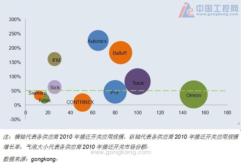 據gongkong《2011年中國離散傳感器市場研究報告》數據顯示,2010年離散傳感器市場迎來高速增長,市場規(guī)模達到34.5億人民幣,同比去年增長43.7%,其中光電開關和接近開關的增長幅度都超過了50%,編碼器增長幅度也超過40%,皆為2007年以來的最高水平。