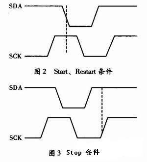 Start和Stop條件:主機(jī)通過發(fā)送Start條件啟動通信,Start、Repeated Start條件如圖2所示,Stop條件如圖3所示。