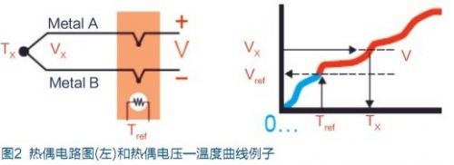 熱電偶是溫度測(cè)量中最常用的傳感器。其主要好處是寬溫度范圍和適應(yīng)各種大氣環(huán)境,而且結(jié)實(shí)、價(jià)低,無(wú)需供電,尤其最便宜。熱電偶由在一端連接的兩條不同金屬線(金屬A和金屬B)構(gòu)成,如圖1所示。當(dāng)熱電偶一端受熱時(shí),熱電偶電路中就有電勢(shì)差??捎脺y(cè)量的電勢(shì)差來(lái)計(jì)算溫度。