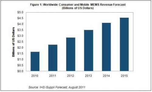 據(jù)IHS公司的消費(fèi)與移動(dòng)MEMS市場(chǎng)研究報(bào)告,微機(jī)電系統(tǒng)(MEMS)市場(chǎng)中最大和最有活力的領(lǐng)域是消費(fèi)與移動(dòng)器件,通過(guò)積極開(kāi)拓智能手機(jī)和平板應(yīng)用,2011年MEMS市場(chǎng)將再度實(shí)現(xiàn)創(chuàng)紀(jì)錄的增長(zhǎng)率。