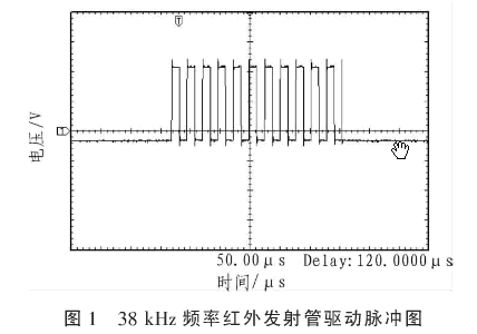 發(fā)射管選取SIR204-A型發(fā)射管,該紅外線二極管驅(qū)動電流范嗣為20~100 mA,其正向?qū)▔航禐?.3~1.5 V,發(fā)出紅外線光波長范圍約為835~930 nm,發(fā)射角度為30°,直射時(shí)紅外線光強(qiáng)度最大。發(fā)射管驅(qū)動電壓采用脈沖電壓,38 kHz載波頻率,發(fā)送時(shí)長為280 μs,占空比為1/2的方波,發(fā)送間隔為720 μs。載波脈沖需要與紅外線接收管的型號相匹配。紅外發(fā)射管能夠匹配光電晶體管、光敏二極管和紅外接收器模塊,紅外傳感器的接收部分選擇了帶有放大和濾波功能的紅外線接收二極管。發(fā)射部分的設(shè)計(jì)需要考慮到接收部分的制約。經(jīng)過驗(yàn)證調(diào)制脈沖驅(qū)動電流能夠匹配紅外線接收管,將紅外線接收管導(dǎo)通。驅(qū)動發(fā)射管PWM的波形如圖1所示。