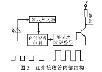 紅外線接收管內(nèi)部電路如圖3所示,紅外線接收二極管內(nèi)部電路將導(dǎo)通后微弱脈沖信號放大、濾波整形,輸出單片機(jī)可以識別的方波脈沖信號。該類型紅外線接收管導(dǎo)通波長范圍約為850~1 050 nm,紅外線發(fā)射管發(fā)射波長約為875 nm,能夠滿足紅外線接收管導(dǎo)通要求。