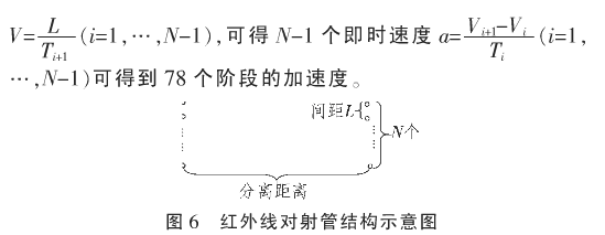 紅外線對射管構(gòu)成一對紅外傳感器收發(fā)子單元。若干對紅外傳感器收發(fā)子單元構(gòu)成完整的紅外線測速傳感器,其紅外線對射管分離距離和紅外傳感器收發(fā)子單元間距可以調(diào)整。如圖6所示,Ⅳ需要大于2,分離距離超過5 m。在兩對紅外線對射管之間測量物體經(jīng)過的時(shí)間T,間距設(shè)置為L,可以得到后一對紅外線對射管的即時(shí)速度V: