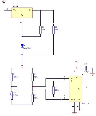 本文采用惠斯通電橋濾出微壓力傳感器輸出的模擬變量,然后用INA118放大器將此信號放大,用7715A/D 進行模數(shù)轉(zhuǎn)換,將轉(zhuǎn)換完成的數(shù)字量經(jīng)單片機處理,最后由LCD 將其顯示,采用LM334 做的精密5 V 恒流源為電橋電路供電,完成了微壓力傳感器接口電路設計,既能保證檢測的實時性,也能提高測量精度。