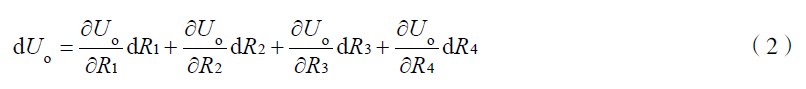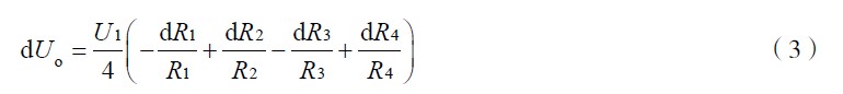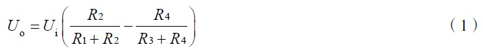 式(4)為電橋轉(zhuǎn)換原理的一般形式。ΔU 為電橋輸出電壓。作為全等臂電橋, ΔR1 = ΔR2 = ΔR 3= ΔR4 ,式(4)變?yōu)?Delta;U =UKε 。