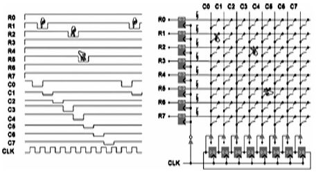 如圖8 所示,8×8 數(shù)字電阻觸摸屏, 基于Altera 解決方案[1]:它采用兩層ITO 分別作為水平的sensing line(觸摸感測(cè)線)和垂直的driving line(加電驅(qū)動(dòng)線),driving line 和sensing line 之間的觸點(diǎn)就相當(dāng)于一個(gè)開關(guān),在未接觸時(shí),它們之間是絕緣的,而接觸發(fā)生后,兩者發(fā)生短路,相當(dāng)于開關(guān)閉合。驅(qū)動(dòng)的時(shí)候,其中sensing line 通常由一個(gè)上拉電阻施加高電平,同時(shí)在driving line 上以一定頻率依次在各列中施加負(fù)脈沖電壓,這樣當(dāng)掃描到觸點(diǎn)所在的那一列時(shí),由于觸點(diǎn)開關(guān)閉合,形成直流通路,使得觸點(diǎn)所在行的電壓被拉低,形成一個(gè)負(fù)脈沖,這樣就檢測(cè)到了觸點(diǎn)的位置。由于driving line 是依次掃描,所以可以檢測(cè)到多個(gè)觸點(diǎn)的位置。