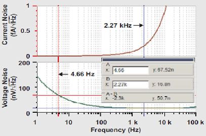 在第一項中,如果INA ≈ 0.01 fA/√HZ ,且RFB =270MΩ,則該項對輸出噪聲的貢獻(xiàn)值約為2.7 nV/ √HZ /5.85=0.5 nV/√HZ .