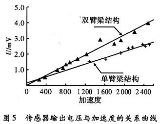 對制作的加速度傳感器樣品,在馬希特?fù)翦N上進(jìn)行了大量地沖擊標(biāo)定測試,測試結(jié)果表明:設(shè)計(jì)和加工制作的加速度計(jì)樣品在進(jìn)行加速度的沖擊時,有較好的信號輸出,單臂梁結(jié)構(gòu)的加速度計(jì)的靈敏度為1 μV/gn;雙臂梁結(jié)構(gòu)的加速度計(jì)的靈敏度為1.6μV/gn,與理論設(shè)計(jì)值基本吻合。
